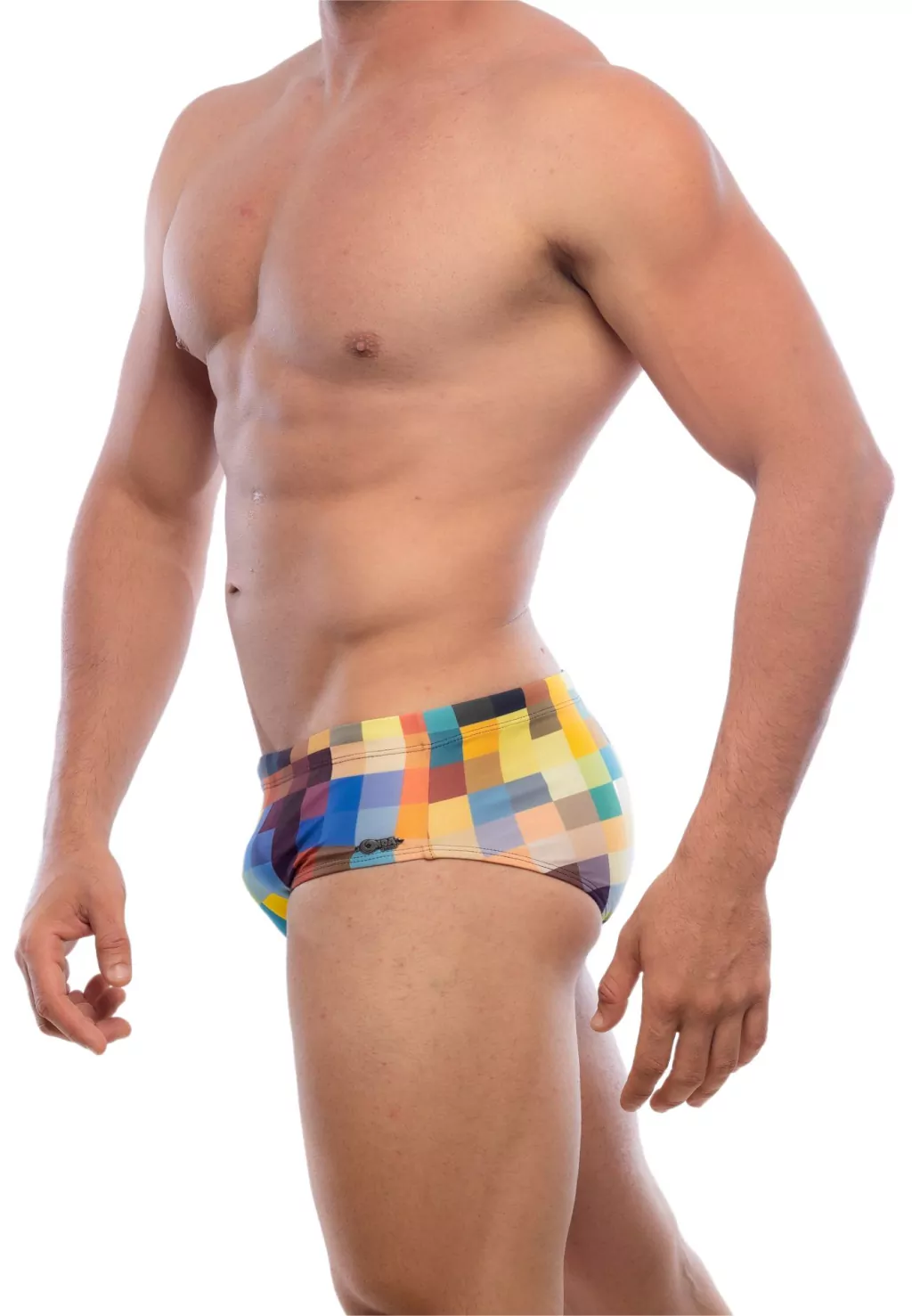 Sunga cavada personalizada Pixel, com ajuste interno. Confeccionada na Lycra. Acompanha o acessório peniano.
